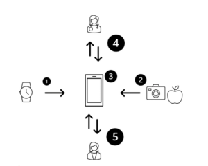 Data from wearable BM sensing devices (1) integrates with accurate calorie data generated by AI (2) to give an account of actual calorie intake vs. self-reported using an app (3). The app can communicate with clinicians and patients alike (4 & 5) to give real time feedback on adherence to dietary interventions